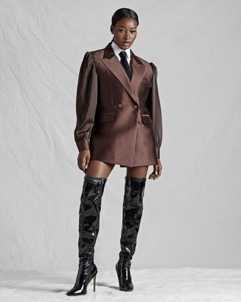 BLACK CROPPED JACKET WITH BROWN SILK LAPEL.