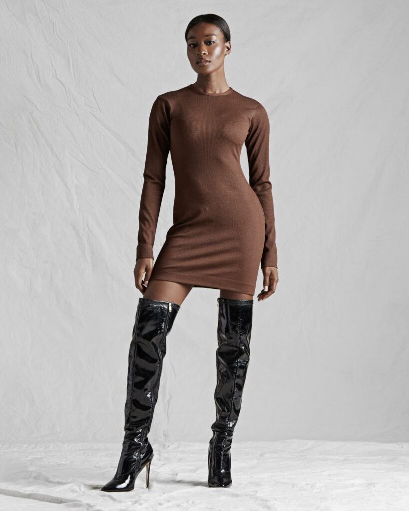 BLACK SKIRT WITH BROWN SILK DETAILING.