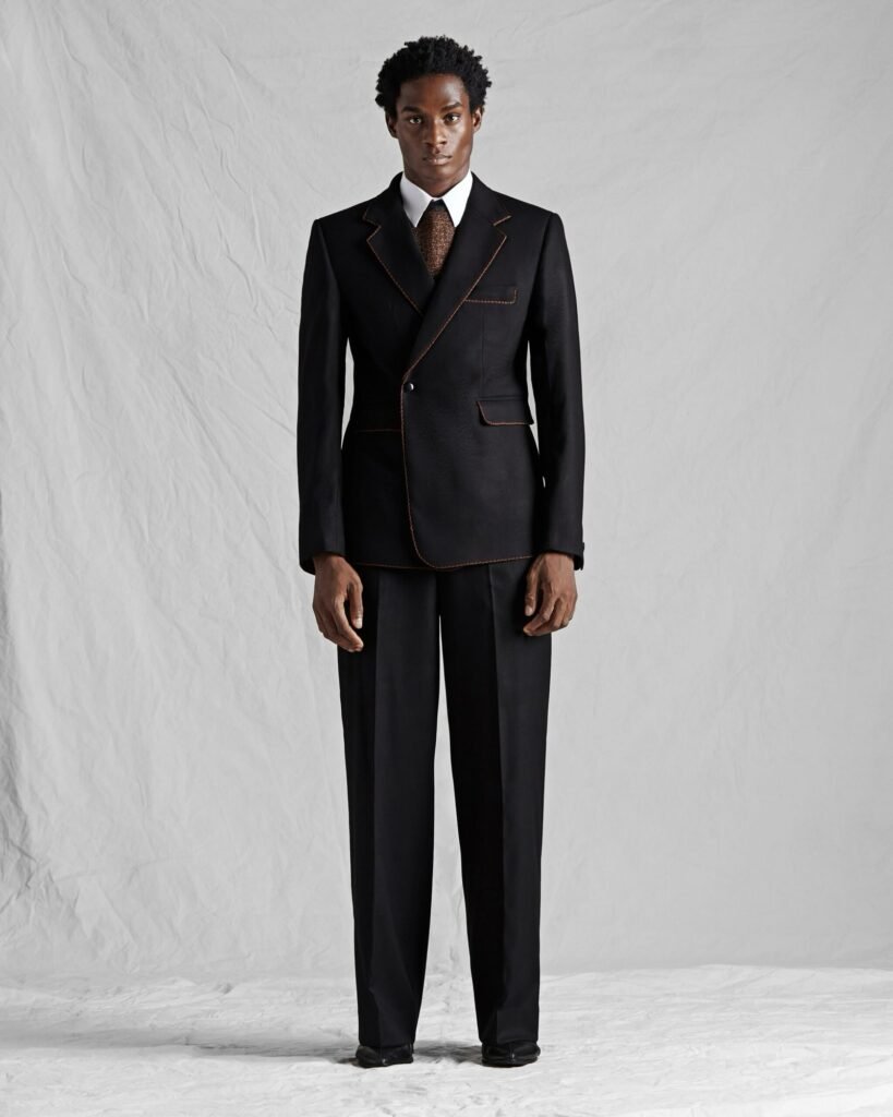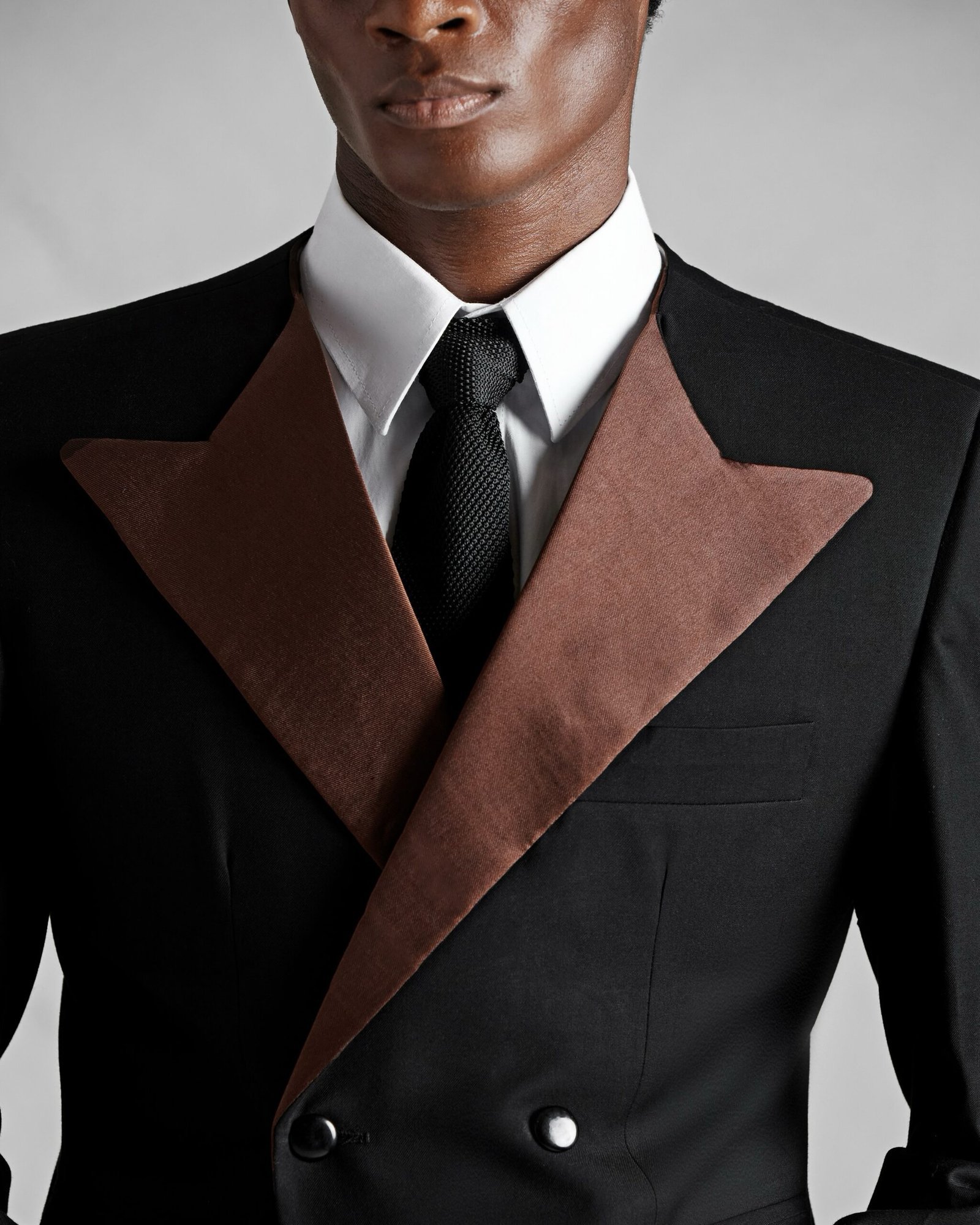 BLACK COLLARLESS DOUBLE BREASTED JACKET WITH BROWN SILK LAPEL.