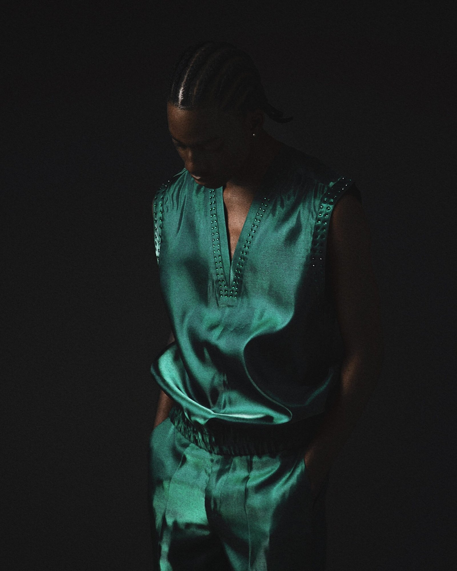 GREEN SLEEVELESS TOP WITH RHINESTONE EMBELLISHMENTS.