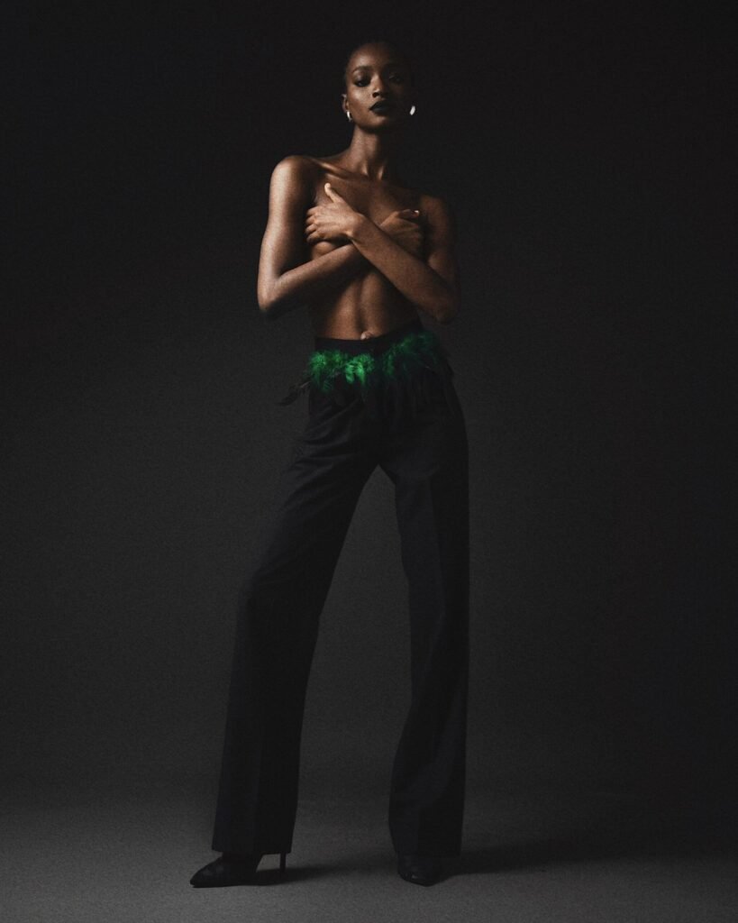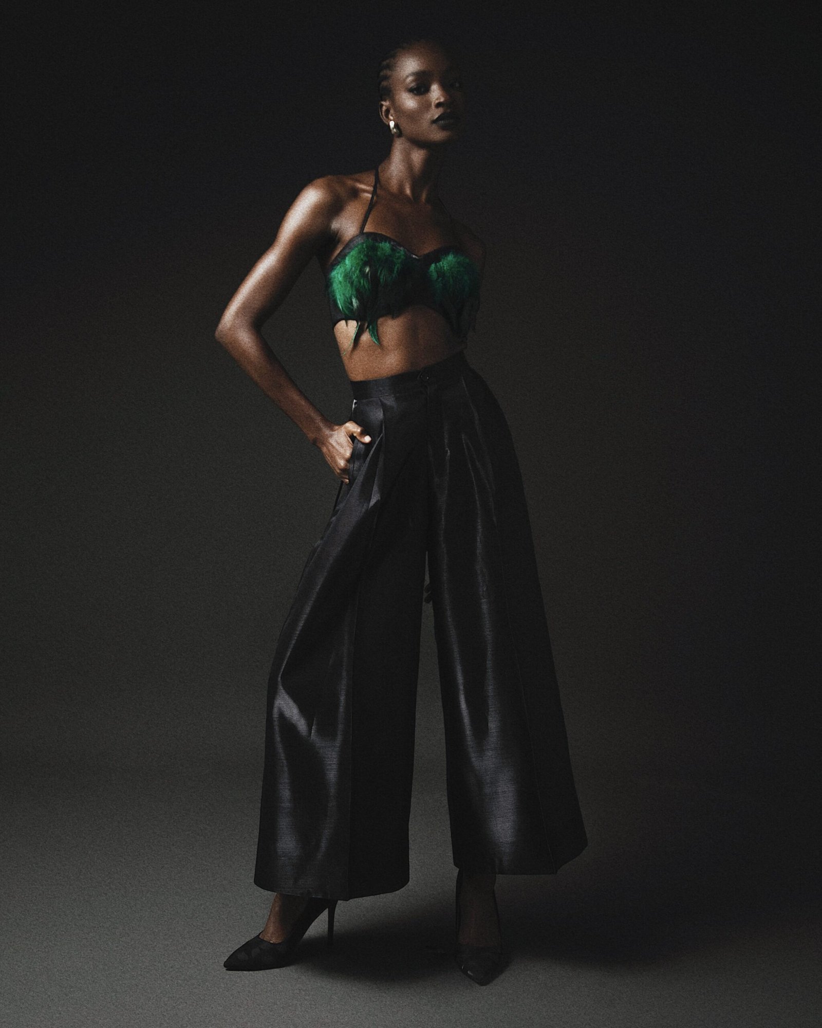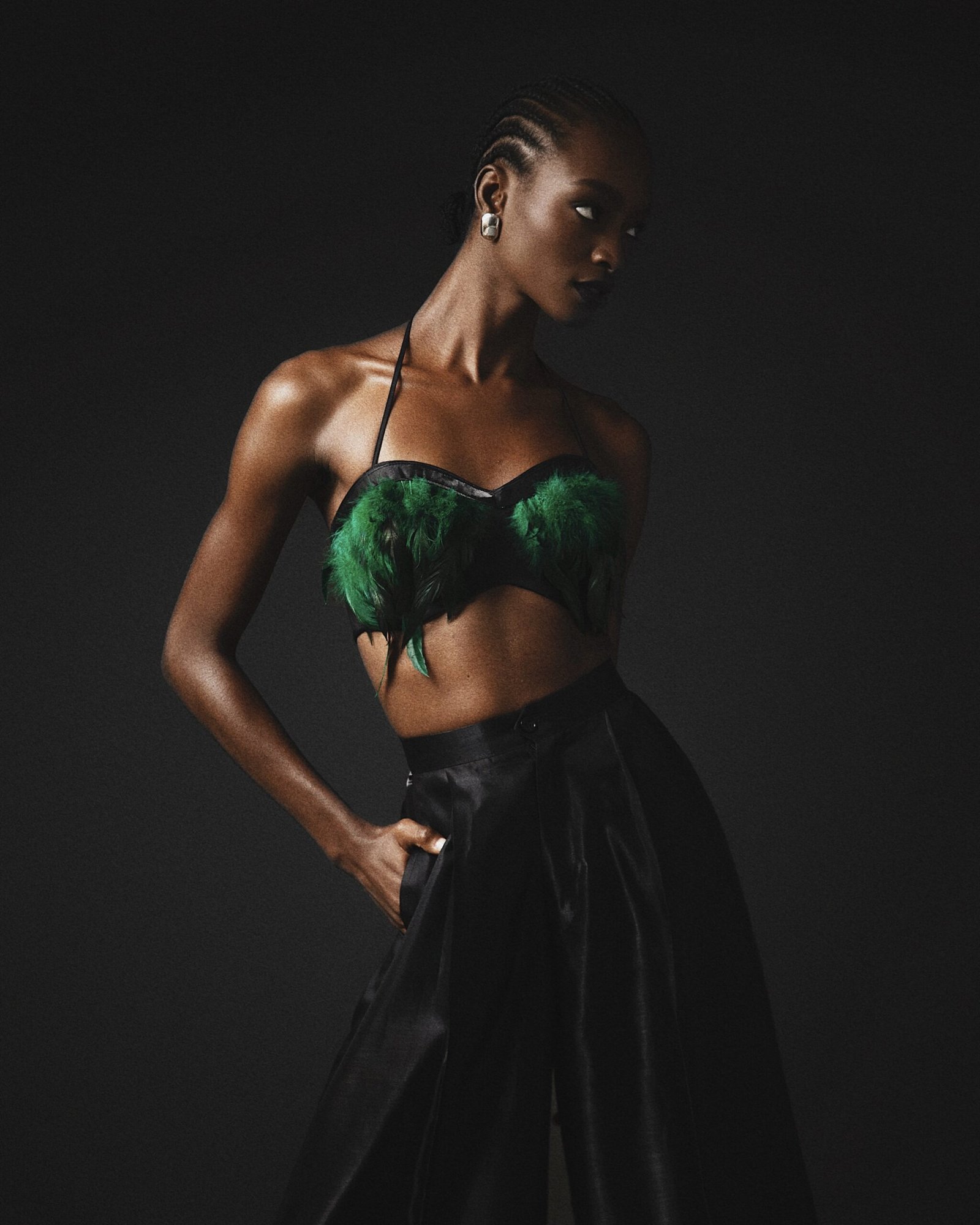 LIQUID SILK BRA TOP WITH FEATHER DETAILING. LIQUID SILK PAIR OF PANTS.
