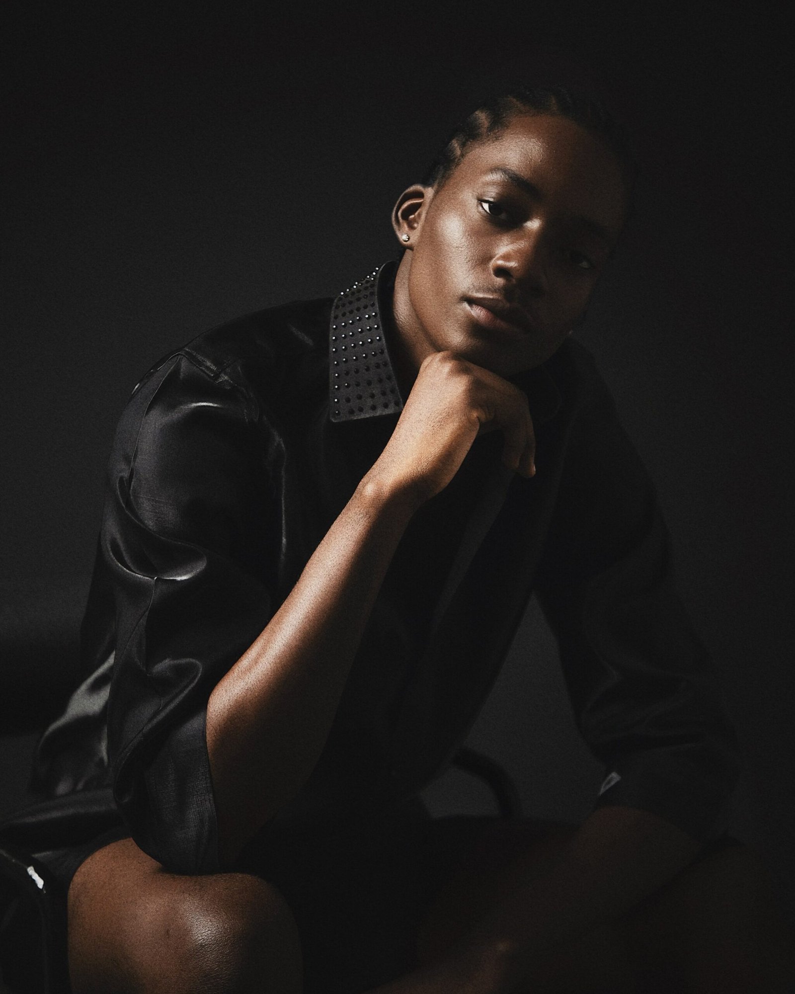 BLACK LIQUID SILK SHIRT WITH RHINESTONE EMBELLISHMENTS ON COLLAR.