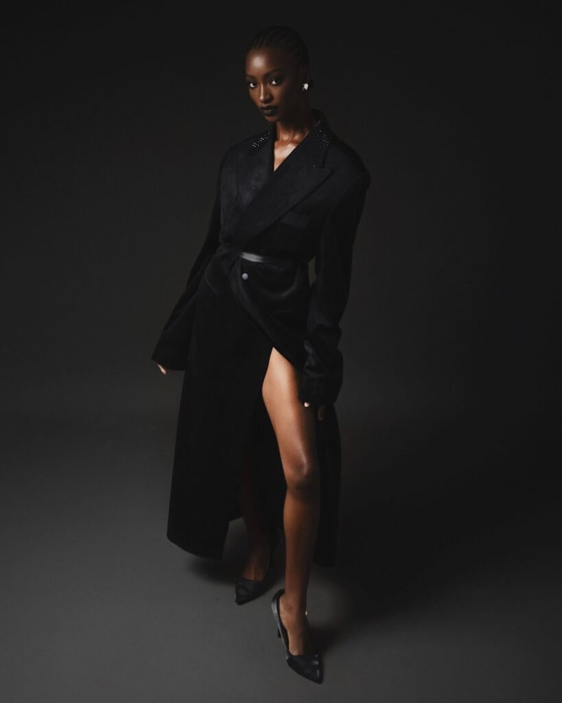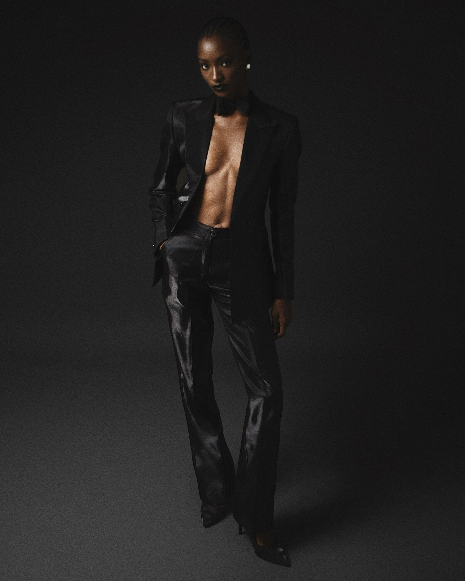 BLACK LIQUID SILK DOUBLE-BREASTED JACKET.