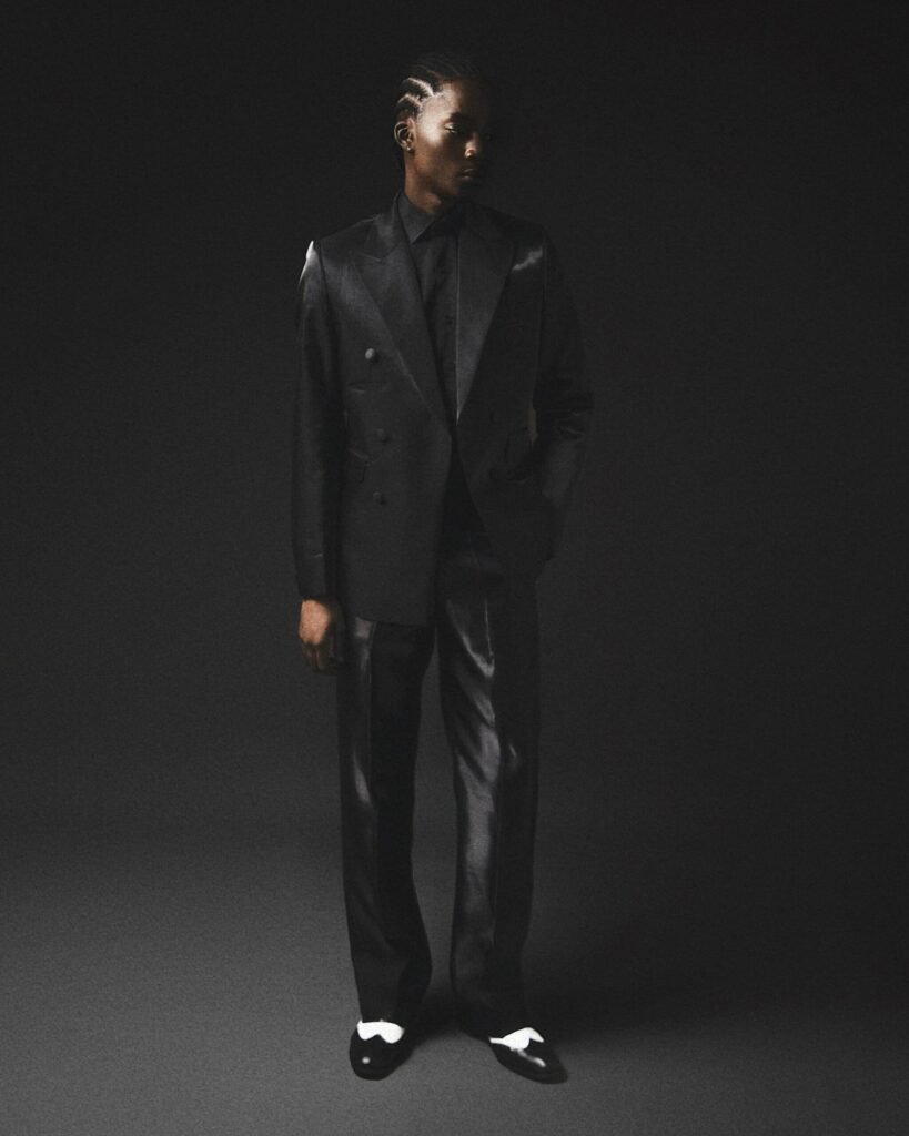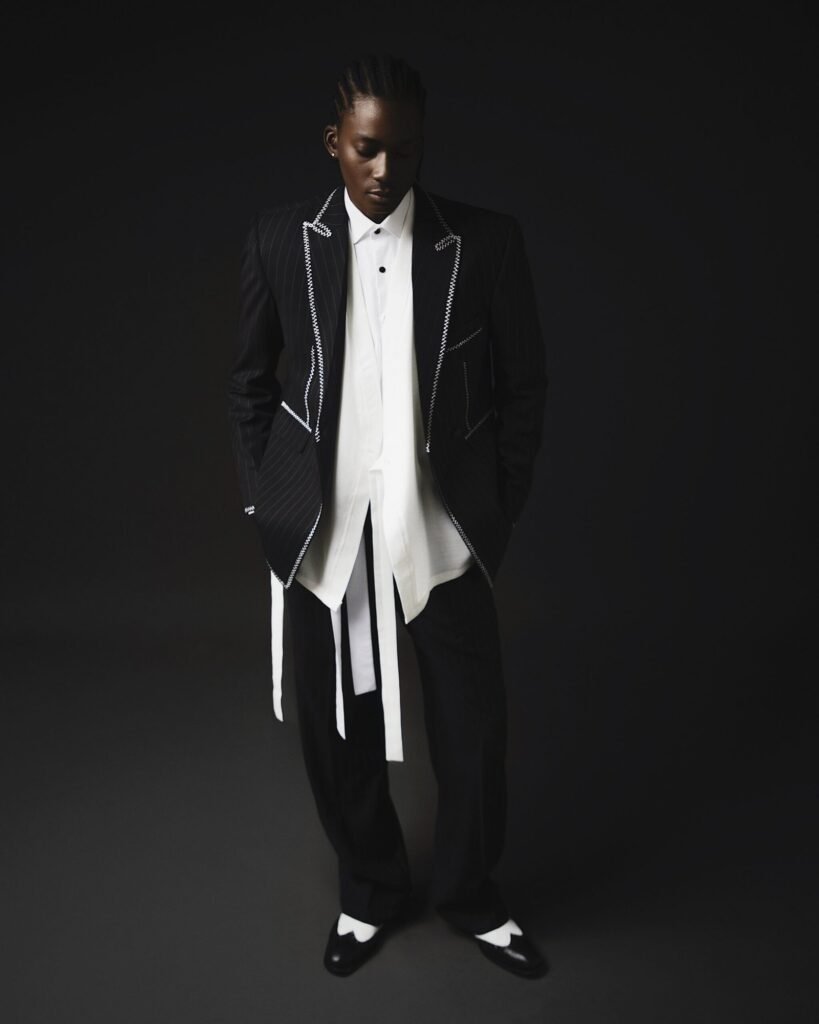 PINSTRIPED DOUBLE-BREASTED LONG JACKET WITH WHITE/GREEN THREADING DETAILING.