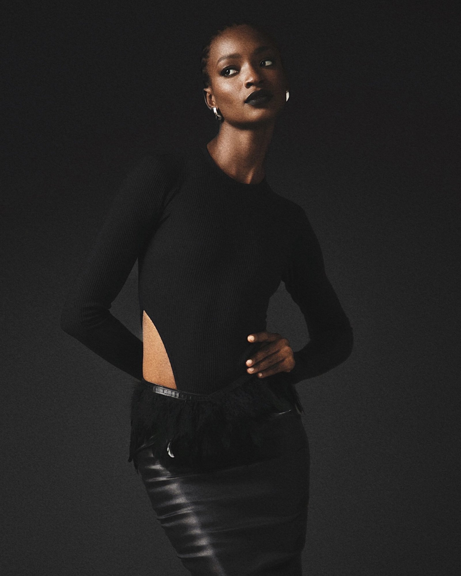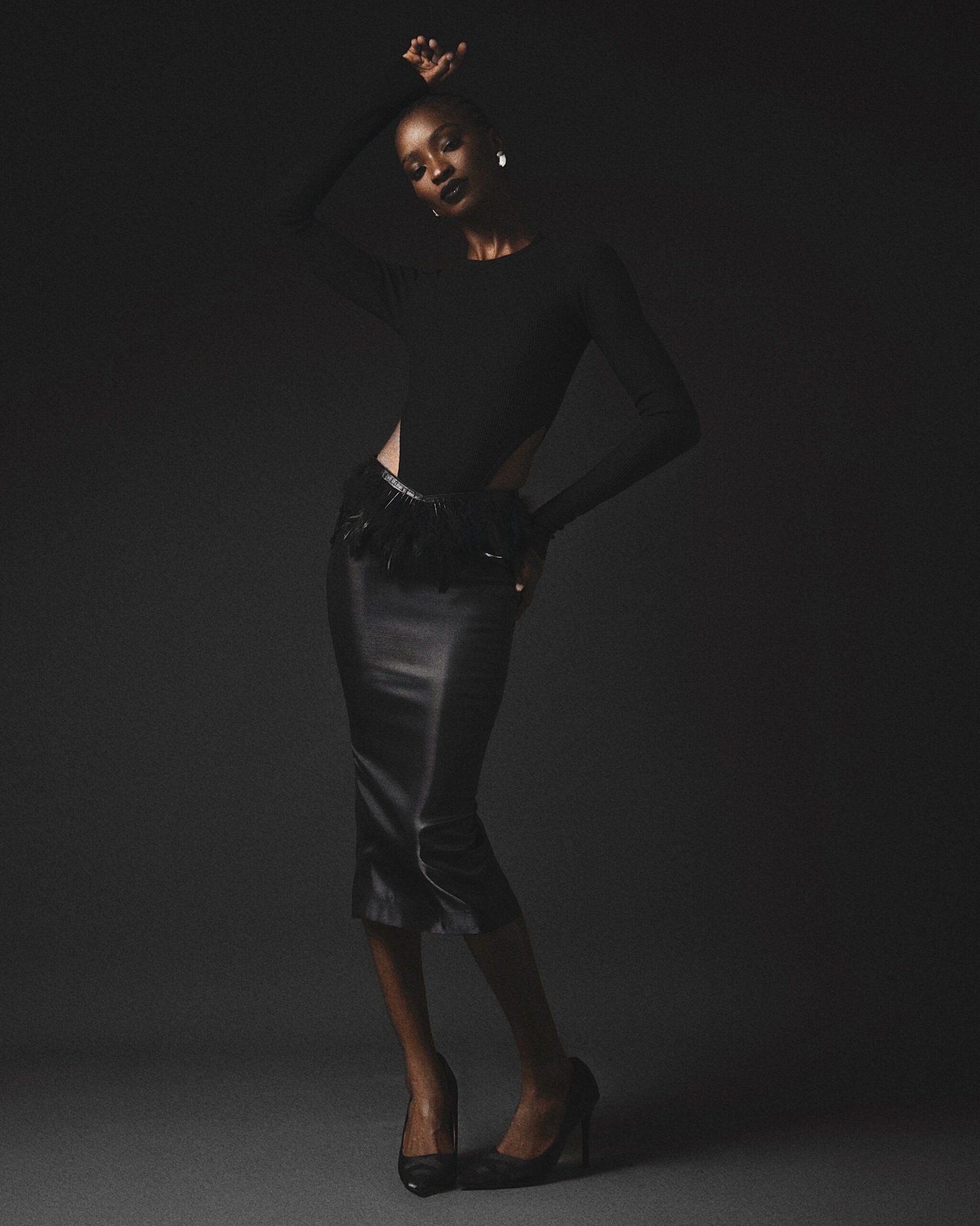 BLACK RIBBED BODYSUIT. BLACK MIDISKIRT WITH FEATHER DETAILING.